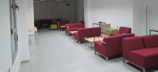 - Aula con ordenadores y zonas de descanso.