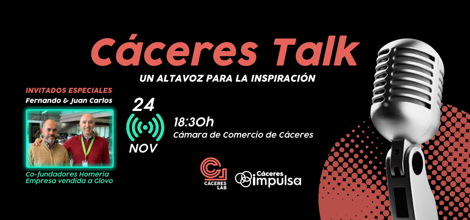 El primer ‘Cáceres Talk’ tendrá lugar el 24 de noviembre a las 18:30 horas, en la sede cacereña de la Cámara de Comercio de Cáceres. Contará con la participación de Fernando Sánchez Figueroa y Juan Carlos Preciado, cofundadores de Homeria Open Solutions, startups cacereña vendida a Glovo.